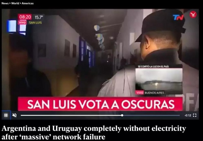據(jù)CNN、BBC等媒體報(bào)道,布宜諾斯艾利斯時(shí)間周日早上7時(shí)、北京時(shí)間16日晚間,阿根廷、巴拉圭和烏拉圭的電力互聯(lián)系統(tǒng)出現(xiàn)“大規(guī)模故障”,導(dǎo)致全部停電。