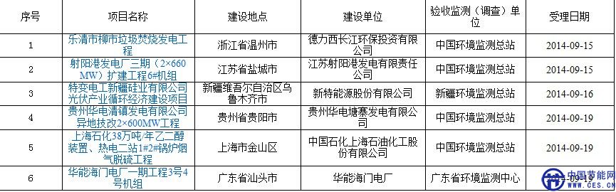 環(huán)保部近日根據(jù)建設(shè)項(xiàng)目竣工環(huán)境保護(hù)驗(yàn)收管理有關(guān)規(guī)定,2014年9月15日—2014年9月19日我部共受理6個(gè)建設(shè)項(xiàng)目竣工環(huán)境保護(hù)驗(yàn)收申請(qǐng)。其中6個(gè)都是電力項(xiàng)目:5個(gè)火電項(xiàng)目,一個(gè)光伏發(fā)電項(xiàng)目。