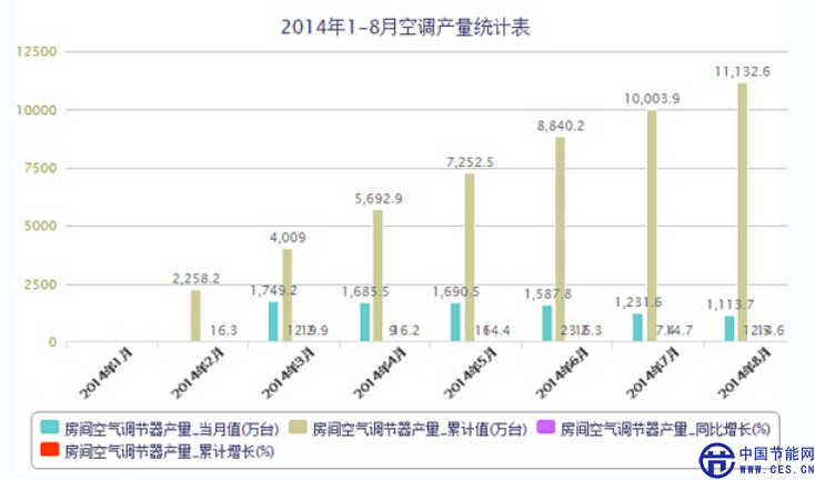 據(jù)國(guó)家統(tǒng)計(jì)局最新統(tǒng)計(jì)數(shù)據(jù)顯示,我國(guó)空調(diào)產(chǎn)量呈現(xiàn)大幅增長(zhǎng)態(tài)勢(shì),今年1-8月份,空調(diào)產(chǎn)品完成產(chǎn)量11132.6萬(wàn)臺(tái),同比增長(zhǎng)12.5%,累計(jì)增長(zhǎng)14.6%,僅8月份實(shí)現(xiàn)1113.7萬(wàn)臺(tái),雖比前幾個(gè)月大幅回落,但依然處在高位運(yùn)行。前八個(gè)月中3月份單月空調(diào)產(chǎn)量1749.2萬(wàn),達(dá)到峰值,隨后幾個(gè)月逐步回落。