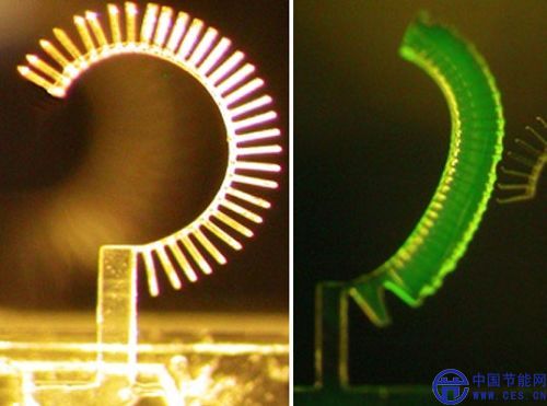 植物蒸騰是指在植物生長期,水分從葉面和枝干蒸發(fā)進入大氣的過程。植物根系從土壤中吸收水分,經(jīng)導管向上移動,在根壓和蒸騰拉力作用下,水分移動達樹梢的葉子,通過葉子表皮的氣孔進行散發(fā)。Michel Maharbiz設計的裝置依靠晶瑩剔透的“水晶樹葉”制造穩(wěn)定的能量流,是一例成功的生物模擬發(fā)明。