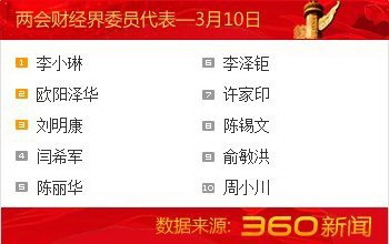 3月10日兩會熱搜財經界代表委員排名。(圖片來源:360新聞中心供圖)