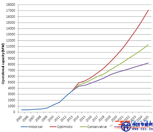 但人們對光熱發(fā)電技術的信心在顯著增強,據海外光熱發(fā)電信息研究機構CSPToday預測,在未來十年內,全球光熱發(fā)電的運行裝機將在2013年3565MW的基礎上至少翻一倍還多。在悲觀、中立、樂觀三種情景模式猜想下,2025年全球光熱發(fā)電裝機容量有望達到8240MW~17100MW的規(guī)模。