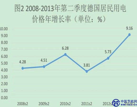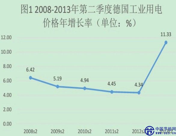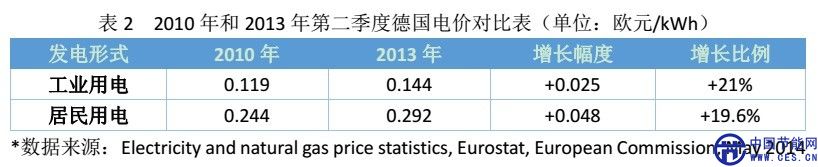 從表2可以看出,相比2010年電價(jià),2013年德國(guó)工業(yè)電價(jià)每度增加了0.025歐元,居民電價(jià)每度增加了0.048歐元。從圖1和圖2可以更加明顯地看出棄核政策對(duì)于德國(guó)電價(jià)的巨大影響。棄核政策帶來的電價(jià)增長(zhǎng)壓力遠(yuǎn)遠(yuǎn)超過了政府的預(yù)期,而電價(jià)的增長(zhǎng)對(duì)于以制造業(yè)為基礎(chǔ)的德國(guó)經(jīng)濟(jì)來說是一個(gè)不小的挑戰(zhàn)。