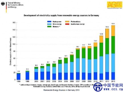 可再生能源的這一承諾已經(jīng)不只是修辭。德國已經(jīng)安裝了比其他任何國家更多的太陽能,盡管擁有一個(gè)相當(dāng)適中的太陽能資源,該國的風(fēng)能直到最近也是世界領(lǐng)先。圖1顯示了2013年德國安裝的可再生能源系統(tǒng)。