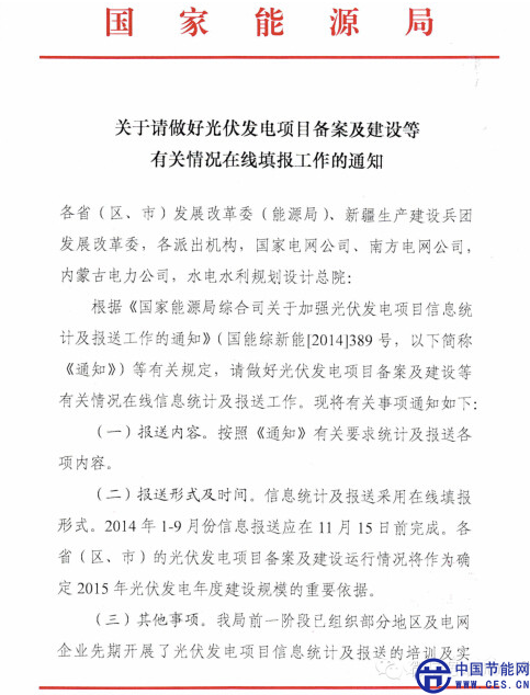 (二)報送形式及時間。信息統(tǒng)計及報送采用在線填報形式。2014年1-9月份信息報送應在11月15日前完成。各省(區(qū)、市)的光伏發(fā)電項目各案及建設運行情況將作為確定2015年光伏發(fā)電年度建設規(guī)模的重要依據(jù)。