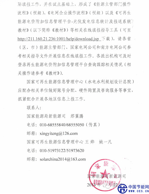 (三)其他事項。我局前一階段已組織部分地區(qū)及電網(wǎng)企業(yè)先期開展了光伏發(fā)電項目信息統(tǒng)計及報送的培訓及實際填報工作,并在試點基礎上,形成了《能源主管部門操作流程》(視頻)、《電網(wǎng)企業(yè)操作流程》(視頻)以及《可再生能源電價附加信息管理平臺-光伏發(fā)電信息統(tǒng)計及報送系統(tǒng)教材》(以下簡稱《教材》)等相關(guān)在線填報指導工具(可至http://211.160.21.236:1001/help/download.jsp下載),請各省(區(qū)、市)能源主管部門、國家電網(wǎng)公司和南方電網(wǎng)公司參考相關(guān)指導文件開展信息在線填報工作。各派出機構(gòu)可及時登錄再生能源電價附加信息管理平臺查詢跟蹤相關(guān)情況(相關(guān)操作請參考《教材》)。