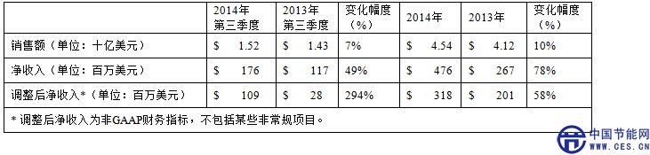 2014年第三季度調(diào)整后的凈收入達(dá)3.18億美元,較上年同期增長了58%。2014年度調(diào)整后的凈收入剔除了由一個衍生合約、多項(xiàng)長期銷售協(xié)議及與外方股利相關(guān)的稅收優(yōu)惠所帶來的損益。2013年調(diào)整后的凈收入剔除了由一個衍生合約、多項(xiàng)長期銷售協(xié)議、資產(chǎn)減值費(fèi)用及重組費(fèi)用所帶來的損益。財報其他相關(guān)信息如下: