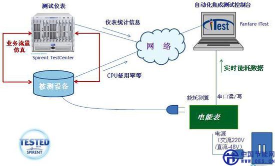 思博倫iTest測(cè)試管理平臺(tái)提供了包括被測(cè)設(shè)備及測(cè)試儀的配置和控制功能,在控制Spirent TestCenter進(jìn)行業(yè)務(wù)流量發(fā)送的同時(shí),可通過(guò)iTest靈活的通信接口可實(shí)時(shí)的從功率計(jì)上獲取功率值,并能動(dòng)態(tài)的對(duì)功率及仿真業(yè)務(wù)的流量大小進(jìn)行計(jì)算,為用戶輸出能效測(cè)試的結(jié)果,從而省去了用戶對(duì)測(cè)試數(shù)據(jù)二次處理的工作。