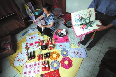 日前,記者來到位于荊州區(qū)八嶺山鎮(zhèn)的王孝珍老人家。一推開老人的房門,從墻上掛的到地上擺放的,沒有一件不是和楚繡有關(guān),而繡花架上,還放著老人未完成的鳳鳥作品??吹接浾?,老人非常高興,騰出地方,小心翼翼的將她的“百寶箱”搬了出來。箱子里的東西讓人大開眼界,繡花鞋、肚兜、門簾等,從頭上戴的配飾到腳下穿的鞋子,足足有一百多件作品,都是老人多年來的心血。