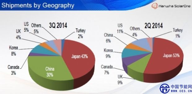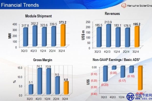 一級(jí)光伏組件制造商韓華新能源(HanwhaSolarOne)報(bào)告,2014年第三季度由于組件出貨量的提高,主要是向中國(guó)的出貨,收入增長(zhǎng)。