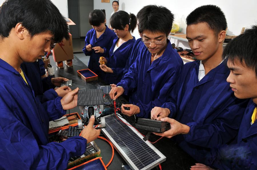 6月13日,新能源科學與工程學院“學生太陽能科技協(xié)會”的學生在利用廢舊材料制作太陽能節(jié)能應用產(chǎn)品。近年來,江西新余學院積極對接地方優(yōu)勢產(chǎn)業(yè),為解決由新能源產(chǎn)業(yè)迅速發(fā)展所帶來的人才瓶頸問題,開展新能源人才培養(yǎng),為新余市新能源產(chǎn)業(yè)發(fā)展提供人才保障和智力支持。按照“以工科為主導、文理為基礎、新能源為特色、多學科協(xié)調(diào)發(fā)展”的辦學思路,新余學院在全國率先成立新能源科學與工程學院,開辦新能源科學與工程、材料物理(新能源方向)、光伏發(fā)電技術(shù)及應用、太陽能光熱技術(shù)及應用等新能源專業(yè),并正在積極申報新能源材料與器件、能源與動力工程等與新能源產(chǎn)業(yè)相關的本科專業(yè),并在新能源產(chǎn)業(yè)相關專業(yè)進行人才培養(yǎng)模式的改革,探索產(chǎn)學政研用相結(jié)合的辦學形式。近年來,新余學院在新能源人才培養(yǎng)方面取得了顯著成效,為新能源企業(yè)輸送了數(shù)千名優(yōu)秀人才,受到了用人單位的青睞。據(jù)悉,“國家新能源科技城”新余是江西省的工業(yè)基地,目前,已形成鋼鐵、新能源和新材料三大產(chǎn)業(yè),其中的新能源產(chǎn)業(yè)亦形成以光伏產(chǎn)業(yè)為核心,風電、節(jié)能減排設備制造業(yè)等其他產(chǎn)業(yè)為補充的產(chǎn)業(yè)集群,顯示出發(fā)展速度快、產(chǎn)業(yè)規(guī)模大、創(chuàng)新能力強、發(fā)展后勁足的優(yōu)勢。