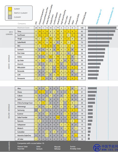 我們不妨看一看這份排名的廬山真面目。該榜單更新于1月11日,在評(píng)分報(bào)告中,天合光能在12項(xiàng)指標(biāo)中有11項(xiàng)獲得最高分,8項(xiàng)獲得滿分,以總分92分的佳績(jī)?cè)趨⒃u(píng)的全球29家太陽能企業(yè)中位列第一。英利綠色能源宣布也獲得了第三高的平均分。然而,值得注意的是,在這個(gè)榜單中,有由多家企業(yè)的某些項(xiàng)目排名都為0分,而前五位的所謂綠色生產(chǎn)領(lǐng)導(dǎo)者的被評(píng)選項(xiàng)目都很全,前三名的三家企業(yè)每項(xiàng)估值都有較好的分?jǐn)?shù)。