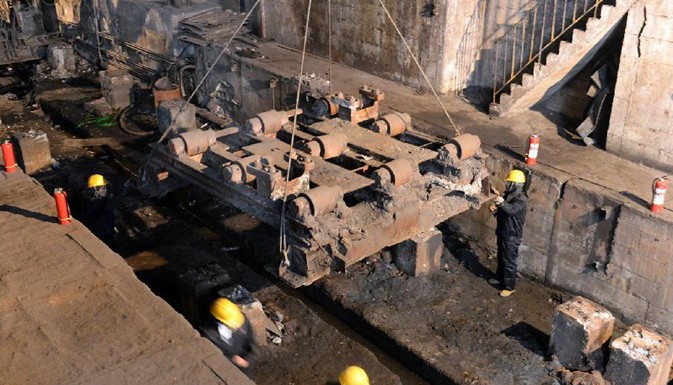 2月23日,工人在河北唐山貝氏體鋼鐵公司轉(zhuǎn)爐車間內(nèi),將拆除后的轉(zhuǎn)爐引錠裝置裝車外運。當(dāng)日,繼2013年11月24日化解鋼鐵過剩產(chǎn)能第一次“周日行動”后,河北省再出重拳,在唐山、邯鄲、秦皇島、邢臺和張家口集中拆除15家鋼鐵企業(yè)高爐16座、轉(zhuǎn)爐3座,壓減煉鐵產(chǎn)能671萬噸、煉鋼產(chǎn)能149萬噸,為確保完成今年壓減粗鋼1500萬噸產(chǎn)能的目標(biāo)任務(wù)奠定了良好基礎(chǔ)。新華社發(fā)(鄭勇 攝)