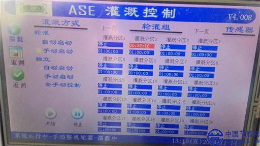 為保證小麥安全越冬,北京市農(nóng)業(yè)技術(shù)推廣站技術(shù)人員及時(shí)調(diào)整冬灌方案,結(jié)合都市型萬(wàn)畝方麥田面積大(6300多畝),輪灌期長(zhǎng)(1個(gè)多月)的實(shí)際情況,提前進(jìn)行時(shí)針式噴灌機(jī)、微噴帶、半固定是噴灌等高效節(jié)水灌溉設(shè)備的檢修和調(diào)試,并于11月10日起開(kāi)始澆凍水,其中時(shí)針式噴灌機(jī)可通過(guò)手機(jī)遙控實(shí)現(xiàn)對(duì)運(yùn)轉(zhuǎn)速度和灌水量的精確控制。266畝微噴灌溉共分3個(gè)輪灌組,安裝了108個(gè)電磁閥控制216個(gè)小區(qū)。通過(guò)中央控制箱可實(shí)現(xiàn)對(duì)每個(gè)輪灌組中單個(gè)小區(qū)定量或變量精確控制。