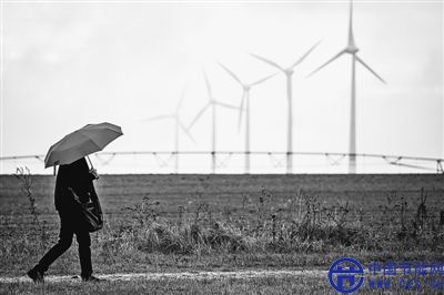 一位女士從德國(guó)柏林南部菲利德海姆村的風(fēng)力發(fā)電廠旁邊經(jīng)過(guò),該村已經(jīng)實(shí)現(xiàn)100%可再生能源發(fā)電。