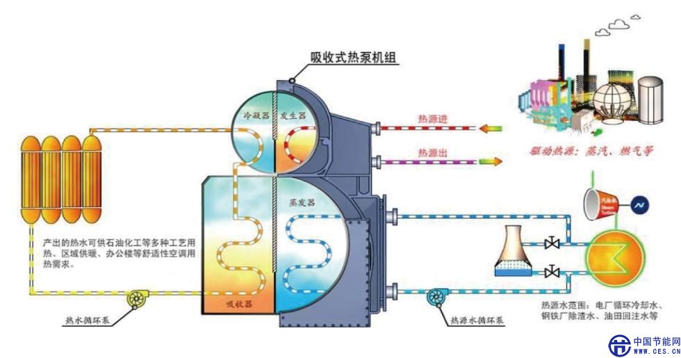 利用吸收式熱泵技術可以利用各種熱能,如以蒸汽、熱水和燃料燃燒產生的煙氣為驅動熱源;以各種低品位熱源,如余熱、排熱、太陽能、地下熱能、大氣和江河湖水等為低溫熱源。