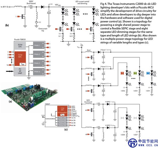 德州儀器C2000微控制器單元(MCU)營銷總監(jiān)Patrick Carner認(rèn)同這種看法。他也指出,德州儀器宣稱其Piccolo MCU可以用于LED驅(qū)動(dòng)器解決方案,允許設(shè)計(jì)者“進(jìn)一步深入數(shù)字電源控制所使用的硬件和軟件”。該公司的C2000 dc-dc LED照明開發(fā)者工具顯示出,驅(qū)動(dòng)單一或多個(gè)共享功率極所需要的正確電源拓?fù)?圖4)。