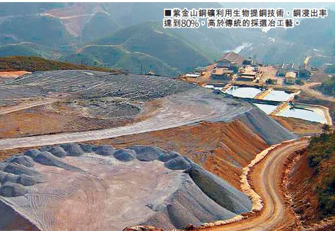 紫金山銅礦利用生物提銅技術(shù),銅浸出率達(dá)到80%,高於傳統(tǒng)的採(cǎi)選冶工藝,而礦石入選品位逐年降低(意味資源利用率提高),到目前就已降至0.3%左右 (傳統(tǒng)工藝只能處理0.8%以上),噸礦處理成本不到50元,相當(dāng)於每噸銅生產(chǎn)成本低於16,500元(傳統(tǒng)工藝每噸銅生產(chǎn)成本在30,000元以上)。