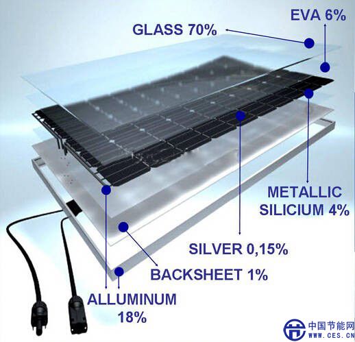 歐盟PVCYCLE組織的研究顯示,以一塊250W的光伏組件為例,玻璃約占總重量的70%左右,鋁邊框約占18%,半導(dǎo)體材料約占4%。如此看來,一塊太陽能組件的大部分重量來自可循環(huán)再造的材料。此外,研究還指出,雖然太陽能組件中包含的銀、銦、鎵等稀有金屬僅占組件總質(zhì)量的1~2%,但是仍具有回收價值。