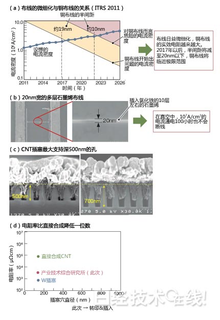 本圖為ITRS 2011上提出的隨著布線的微細(xì)化,銅存在課題(a),以及產(chǎn)業(yè)技術(shù)綜合研究所制作的20nm寬多層石墨烯布線(b)和CNT插塞(c)。((b、c)由產(chǎn)業(yè)技術(shù)綜合研究所拍攝)