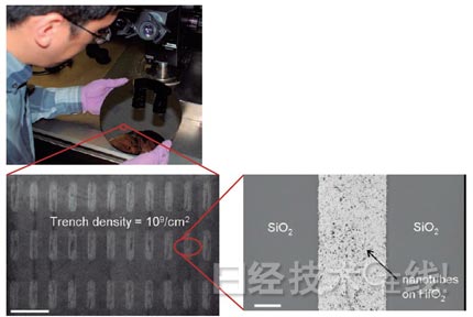大規(guī)模集成CNT晶體管時(shí)的課題是,沒(méi)有在微細(xì)區(qū)域朝著目標(biāo)方向排列CNT的方法。美國(guó)IBM公司2012年10月宣布,利用自組織現(xiàn)象解決了該課題(圖8)。在SiO2基板上形成HfO2的微細(xì)圖案后,涂布CNT溶液,CNT就會(huì)在HfO2上朝著目標(biāo)方向排列。