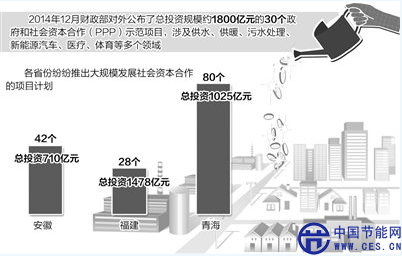 如果說2014年是我國PPP模式的探路之年,那么2015年將成為各級政府和社會資本合作的元年。2014年12月財政部對外公布了總投資規(guī)模約1800億元的30個政府和社會資本合作(PPP)示范項目,涉及供水、供暖、污水處理、新能源汽車等多個領(lǐng)域。從地方來看,各省份紛紛推出大規(guī)模發(fā)展PPP項目計劃。比如,安徽發(fā)布42個PPP項目,總投資710億元;福建公布28個試點項目,總投資1478億元;青海第一批80個項目,總投資1025億元。