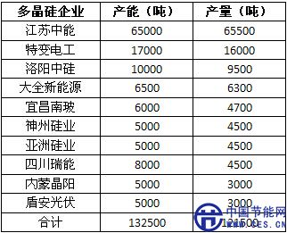 數(shù)據(jù)顯示,2014年,包括江蘇中能、特變電工、洛陽中硅、大全新能源、宜昌南玻、神州硅業(yè)、亞洲硅業(yè)、四川瑞能、內蒙晶陽、盾安光伏在內的十家主要多晶硅企業(yè)總產(chǎn)能達到132,500噸,總產(chǎn)量達到121,500噸。