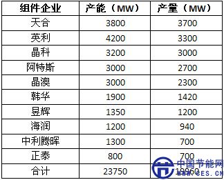 組件環(huán)節(jié),天合、英利、晶科、阿特斯、晶澳、韓華、昱輝、海潤、中利騰暉、正泰等十家企業(yè)的總產(chǎn)能達到23,750MW,總產(chǎn)量達到19,960MW。