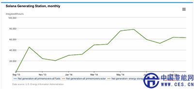 據(jù)美國能源信息署EIA數(shù)據(jù),該電站在過去的12個月內總發(fā)電量為597000MWh,低于設計發(fā)電量9.44億度的預期。當然,對于新投運的光熱項目而言,達到設計發(fā)電量需要一段過渡期。