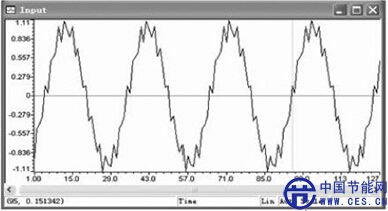 為了說明自適應(yīng)濾波器的優(yōu)越性,這里通過仿真結(jié)果來表明。通過引入一個已有的數(shù)據(jù)文件方式得到一個受到噪聲干擾的正弦波信號,該波形作為自適應(yīng)濾波的輸入信號。自適應(yīng)濾波程序在CCS 環(huán)境下編譯、鏈接、修改語法錯誤,編譯鏈接通過后,加載并連接程序,連接生成公共目標代碼文件,在線下載到DSP中運行。將編譯產(chǎn)生的可執(zhí)行文件下載到 DSP芯片中后,經(jīng)過運行得到時域圖,輸入信號的時域圖如圖6所示。