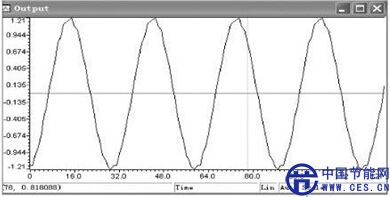 由圖6可以看到,低頻信號中疊加了有噪聲信號,導(dǎo)致低頻信號出現(xiàn)了較大的畸變。低頻的信號中疊加了比較多的高頻噪聲,只有進行高頻濾波才能夠得到比較好的原始低頻信號。在觀察輸出波形時,能夠看到輸出波形中僅剩余了低頻信號,濾除了高頻成分。通過圖6 和圖7的對比,輸入信號的高頻噪聲基本上得到了濾除。但是由于參數(shù)設(shè)置不夠精確等原因造成的高頻噪聲沒有得到完全消除,但是也很明顯的顯現(xiàn)了低通濾波的目的。