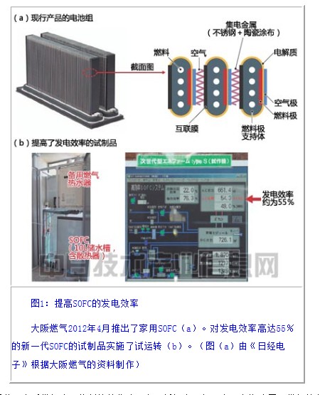 大阪燃氣2012年4月推出了家用SOFC(a)。對發(fā)電效率高達55%的新一代SOFC的試制品實施了試運轉(zhuǎn)(b)。(圖(a)由《日經(jīng)電子》根據(jù)大阪燃氣的資料制作)