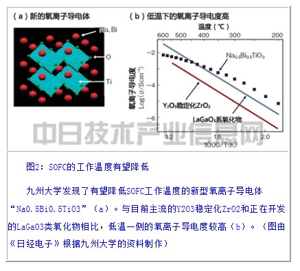 決定SOFC工作溫度的,是電解質(zhì)的氧離子導電體。目前采用的是Y2O3穩(wěn)定化ZrO2,工作溫度為700~750℃,正在討論采用LaGaO3,據(jù)說有望把溫度降到600℃左右。日本九州大學2013年11月宣布,發(fā)現(xiàn)了有望把工作溫度降到400~500℃左右的新型氧離子導電體(圖2)