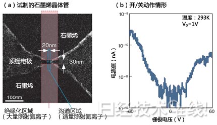 本圖是在晶圓上形成石墨烯圖案,并將部分制成半導(dǎo)體型的技術(shù)。用氦離子顯微鏡向石墨烯照射氦離子,根據(jù)照射強(qiáng)度的不同,或形成半導(dǎo)體型,或形成絕緣體。利用該技術(shù)制造的石墨烯晶體管在室溫環(huán)境下,電流的導(dǎo)通/截止比實(shí)現(xiàn)了約100的開(kāi)關(guān)性能。(圖和照片由產(chǎn)業(yè)技術(shù)綜合研究所提供)