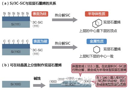 雙層石墨烯根據(jù)上下層的重疊方法的不同,分為有帶隙和沒(méi)帶隙的情況(圖6)。利用對(duì)硅上的3C-SiC薄膜進(jìn)行熱分解的方法在硅(111)面上形成的雙層石墨烯為半導(dǎo)體型,在其他硅面上形成的雙層石墨烯為金屬型。末光等人發(fā)現(xiàn),通過(guò)硅(100)晶圓表面的蝕刻形成傾斜面的話,傾斜面會(huì)變成硅(111)。