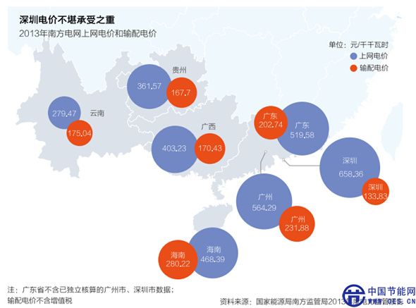 第一組數(shù)據(jù)是上網(wǎng)電價,即電網(wǎng)購電的成本。2013年,南方電網(wǎng)整體的平均上網(wǎng)電價是每千瓦時0.424元,廣東省是0.519元,廣州市是0.564元,深圳為0.658元,是全省最高。