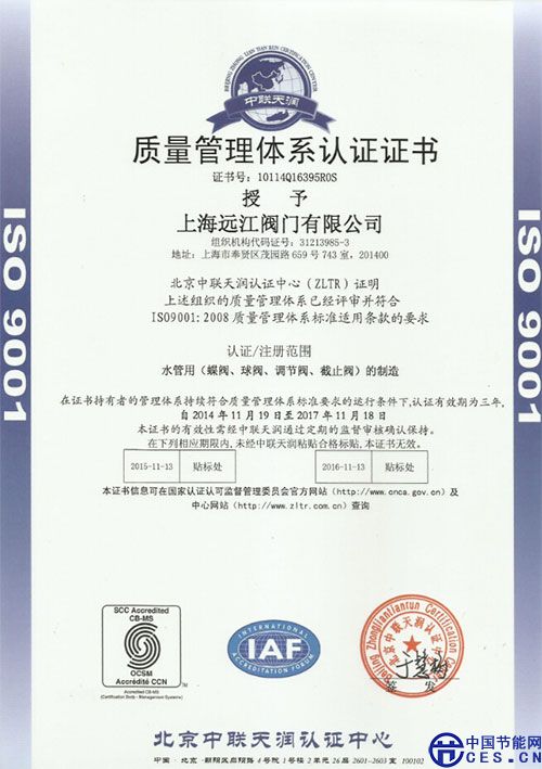 2014年11月,北京中聯天潤質量認證中心審核專員蒞臨我公司進行審核,經過對各部門貫徹質量管理體系工作情況以及公司管理方式的全面審核,專家組成員一致認定遠江閥門的質量管理體系符合認證要求,可有效運行,順利通過了質量體系監(jiān)督審核工作,頒發(fā)了公司質量管理體系認證證書。在此,進一步證明了我公司運營、生產和服務的高質量水平,為后續(xù)產品市場推廣,提供了有力保障。