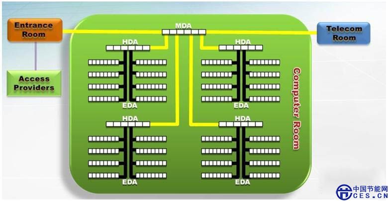 合理有效的線纜布局決定了網絡物理層的基礎,對于節(jié)約電能、節(jié)能降耗起到重要作用。要據(jù)TIA-942標準(見圖三),將數(shù)據(jù)中心劃分成MDA,HDA,EDA,ZDA等幾大區(qū)域。從MDA到HAD采用OM3預連接光纜,從而優(yōu)化主配線區(qū)到列頭柜之間的連接。解決從主交換路由到每一列機柜的列頭柜二層交換機的連接。每列列頭柜交換機及KVM設備通過絧纜或光纜跳線再連接到每一個服務器上去。它的優(yōu)點是節(jié)省從主交換機到用戶服務器線纜的數(shù)量,從而減少對機房冷熱通道的阻隔。