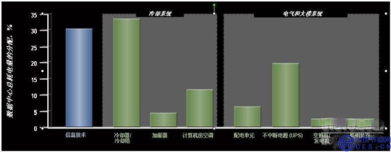 數(shù)據(jù)中心能源消耗巨大,并呈不斷加大的勢頭,占全球碳排放的比例不斷上升,提升數(shù)據(jù)中心能效刻不容緩。“綠色電網”(Green Grid)是一個非盈利性IT人員組織,它推出了兩個知名的衡量能效的標準,分別是PUE和DCiE(PUE的倒數(shù))。衡定數(shù)據(jù)中心節(jié)能的重要指標PUE(電源使用效率)可以從根本上讓你知道總體消耗的電力以及用于實際計算目的的電力。PUE是一個比值,其基準值為2,越接近1表明能效水平越高,在目前的技術水平和設備條件下,還無法在數(shù)據(jù)中心系統(tǒng)上讓PUE達到1的水平。整個數(shù)據(jù)中心的能源消耗包括供應到冷卻設備,冷卻器,照明,存儲節(jié)點以及服務器,工作站以及網關等設備的耗電(見圖二)。