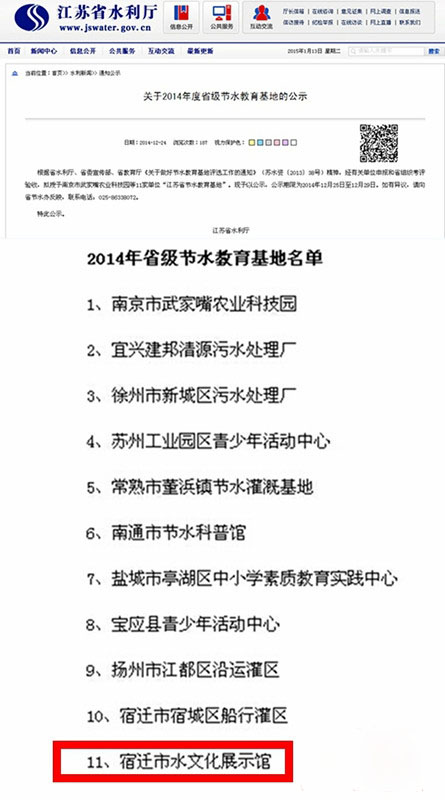 2014年12月24日,聯(lián)合水務(wù)投資建設(shè)的宿遷市水文化展示館在“江蘇省節(jié)水教育基地”現(xiàn)場(chǎng)評(píng)審中,以95分的高分順利通過(guò)現(xiàn)場(chǎng)專家組評(píng)審。并在12月24日至29日為期五天的公示后,正式成為江蘇省首批獲評(píng)“江蘇省節(jié)水教育基地”的11家單位之一。