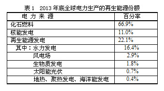 雖然各國情況不同,其再生能源的商品價格也各不相同,但從這些表中可以看出,發(fā)電成本最低仍然是火力發(fā)電,特別是燃煤發(fā)電;在清潔能源中,水力發(fā)電是最低的,其次為核能發(fā)電。火力發(fā)電、水力發(fā)電和核能發(fā)電的商品價格都容易被市場接受,而再生能源發(fā)電從表1可以看出,2013年水力發(fā)電和風(fēng)電場所占份額最高,兩者占再生能源發(fā)電的87.3%,其電力價格均可被市場接受。
