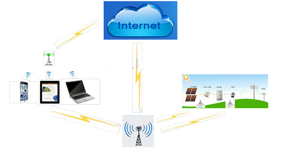 智能光伏電站在中控室附近設(shè)置中央通訊基站,在光伏區(qū)和設(shè)備區(qū)設(shè)置若干個子基站以加強(qiáng)信號接收和傳遞,光伏電站的監(jiān)控信號和控制信號通過無線通訊技術(shù)進(jìn)行傳輸,中控室接受到信號后通過互聯(lián)網(wǎng)將實時數(shù)據(jù)自動上傳到云儲存,運(yùn)維人員可在任何有無線網(wǎng)絡(luò)的地方通過手機(jī)客戶端或使用基于互聯(lián)網(wǎng)Web的軟件調(diào)用云儲存信息對電站進(jìn)行監(jiān)視和控制。示意圖如圖3: