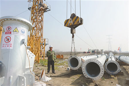 日前,工人在江蘇鹽城境內(nèi)1000千伏淮南-南京-上海特高壓輸電線路施工工地架設(shè)鐵塔。該工程進(jìn)展順利,預(yù)計(jì)5月底即可具備放線條件。
