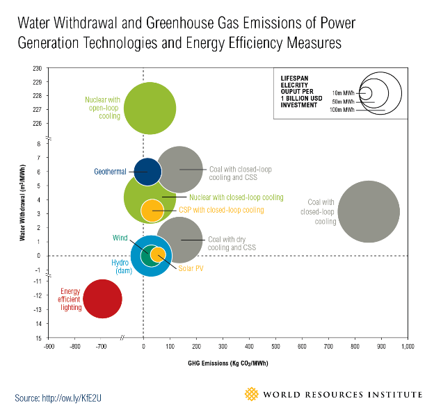 世界資源研究所開展了“水-氣候影響分析”,比較了發(fā)電技術(shù)對水資源、溫室氣體排放和資金成本的影響。下圖分析了各項技術(shù)下每兆瓦時發(fā)電量的淡水取水量和溫室氣體排放,突出每項技術(shù)全生命周期生產(chǎn)或節(jié)約的電量,并根據(jù)資金成本進行排序(按照2010年中國的技術(shù)成本計算)。例如,核電需要大量冷卻用水,而溫室氣體排放則可忽略不計。生命周期中每10億美元投資可產(chǎn)生160TWh左右的發(fā)電量。