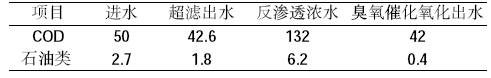 大榭石化年加工原油800萬t,主要產(chǎn)品包括化工輕油、低硫工業(yè)燃料油、催化原料油、焦化原料油以及瀝青等。由于所加工原油種類較多且更換頻繁,導致煉化污水水質(zhì)波動,處理難度加大。為了提升污水處理效果,增大污水回用率,減少COD排放量,大榭石化于2010年啟動了“超濾+反滲透+臭氧催化氧化”的污水深度處理回用項目,此項目于2011年1月開工建設(shè),5月投產(chǎn),9月通過了性能標定,標定期間的運行數(shù)據(jù)見表1。