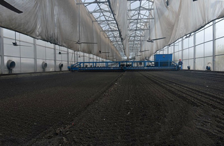 大型機械正在對污泥處理后生成的有機碳土進(jìn)行干化處理