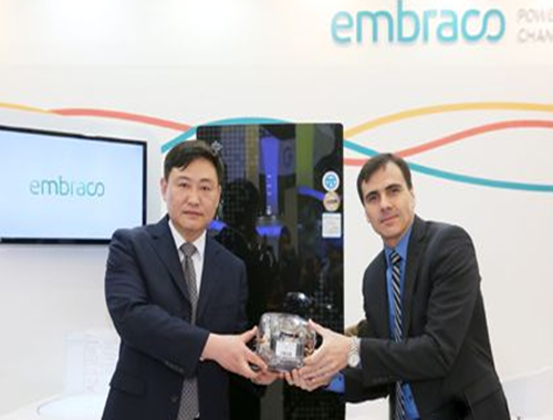 恩布拉科全球銷售與市場副總裁,北京恩布拉科雪花壓縮機(jī)有限公司總經(jīng)理路易斯.道(右)與晶弘電器有限公司常務(wù)副總經(jīng)理李琦(左)聯(lián)合展示最高能效、最安靜的恩布拉科VESF全驅(qū)變頻壓縮機(jī)