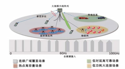 在熱點(diǎn)高容量場景,極高的用戶體驗速率和極高的流量密度是該場景面臨的主要挑戰(zhàn),超密集組網(wǎng)能夠更有效地復(fù)用頻率資源,極大地提升單位面積內(nèi)的頻率復(fù)用效率;全頻譜接入能夠充分利用低頻和高頻的頻率資源,實現(xiàn)更高的傳輸速率;大規(guī)模天線、新型多址等技術(shù)與前兩種技術(shù)相結(jié)合,可實現(xiàn)頻譜效率的進(jìn)一步提升。