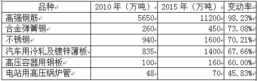 《鋼鐵工業(yè)“十二五”發(fā)展規(guī)劃》公布2011~2015年期間,2015年關(guān)鍵鋼材品種消費(fèi)預(yù)測(cè)值,其中,高強(qiáng)鋼筋等鋼材品種消費(fèi)量增幅較大(見下表)。