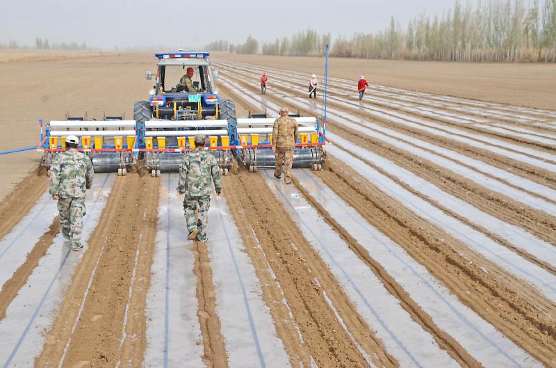 阿拉爾墾區(qū)針對水資源日趨緊張的實際情況,大力發(fā)展高效節(jié)水農(nóng)業(yè),墾區(qū)各植棉團(場)通過“干播濕出”技術(shù)(減少棉田春灌用水,探索棉花播后引墑出苗的播種方式)種植棉花,節(jié)約水資源。
